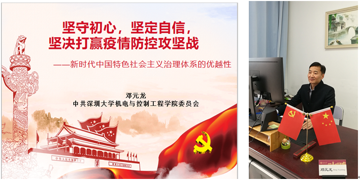 2020年春季学期“思政第一课”云端开讲。学院党委书记邓元龙教授以《坚守初心,坚定自信,坚决打赢疫情防控攻坚战——新时代中国特色社会主义治理体系的优越性》为题,在线给学院180名入党积极分子上了一堂生动的“思政第一课”。