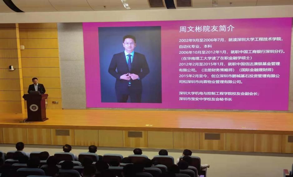 庄严的国歌声拉开了大会的帷幕。毕业于机电学院自动化专业的周文彬院友首先给同学们分享了自己的经历,告诫大家应当以乐观向上的态度面对挑战,要承续学院“精工践行,致臻如一”的优良传统,积极探索大学生活。