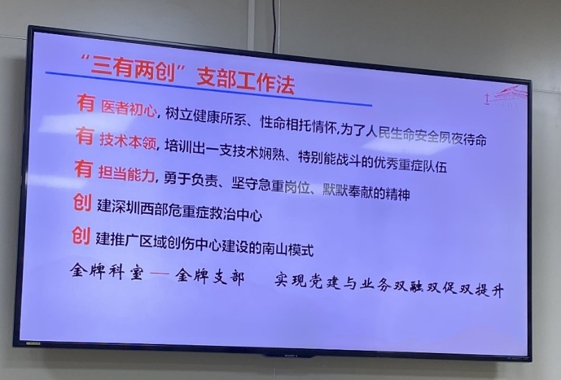 南山医院副院长莫蓓蓉,重症医学科党支部书记、EICU主任张海钢,护理部副主任、支委何桂兰、ICU一病区副主任索质君、ICU二病区副主任、支委肖水明、ICU一病区护士长蒙斯雅、EICU护士长秦玉菊和ICU二病区护士长杨郑参加活动。2021年,重症医学科党支部荣获深圳市先进基层党组织,张海钢书记荣获市优秀共产党员,该支部在抗击疫情过程中,充分发挥战斗堡垒作用,多次获得先进表彰和各种荣誉。会上,张海钢书记介绍了支部的基本情况及特色做法,一方面党支部加强理想信念教育,敬佑生命,救死扶伤;另一方面,以实现党建与业务双融双促双提升为目标,提出“三有两创”的支部工作法,取得丰硕成果。