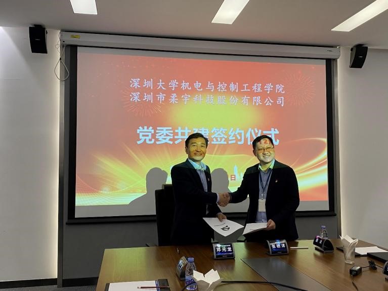 党委书记邓元龙,党委委员、副院长龚峰,机械系主任徐斌,自动化系主任陈宏,自动化系支部书记王兴政,支委刘艺涛一行,前往柔宇科技公司开展党建互学暨共建签约仪式。