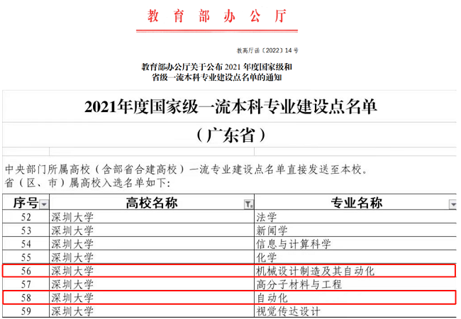 机械设计制造及其自动化、自动化2个专业入选国家级一流本科专业建设点名单。