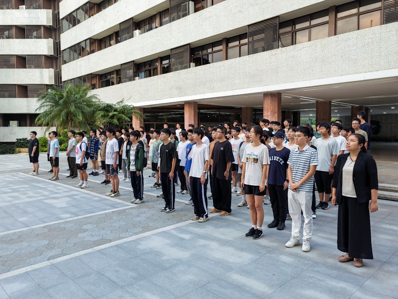 校旗在《歌唱祖国》乐声中缓缓升上旗杆,唤醒荔园新的一天。
