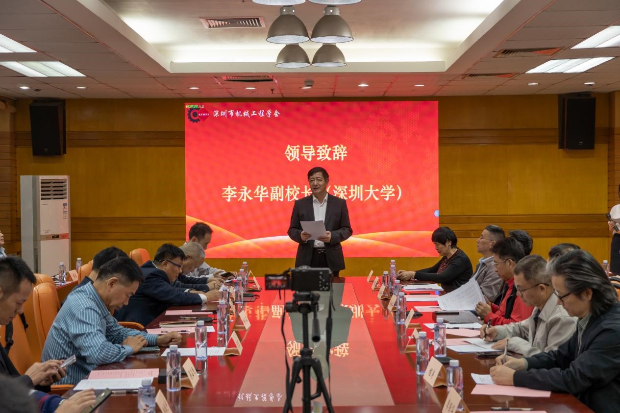 副校长李永华致辞,祝贺深圳市机械工程学会先进制造分会的成立,期望先进制造分会融合深圳市高校学者教授对接深圳市先进制造产业,努力做好产业服务,把高校科研成果转化为生产力,促进地方经济发展。