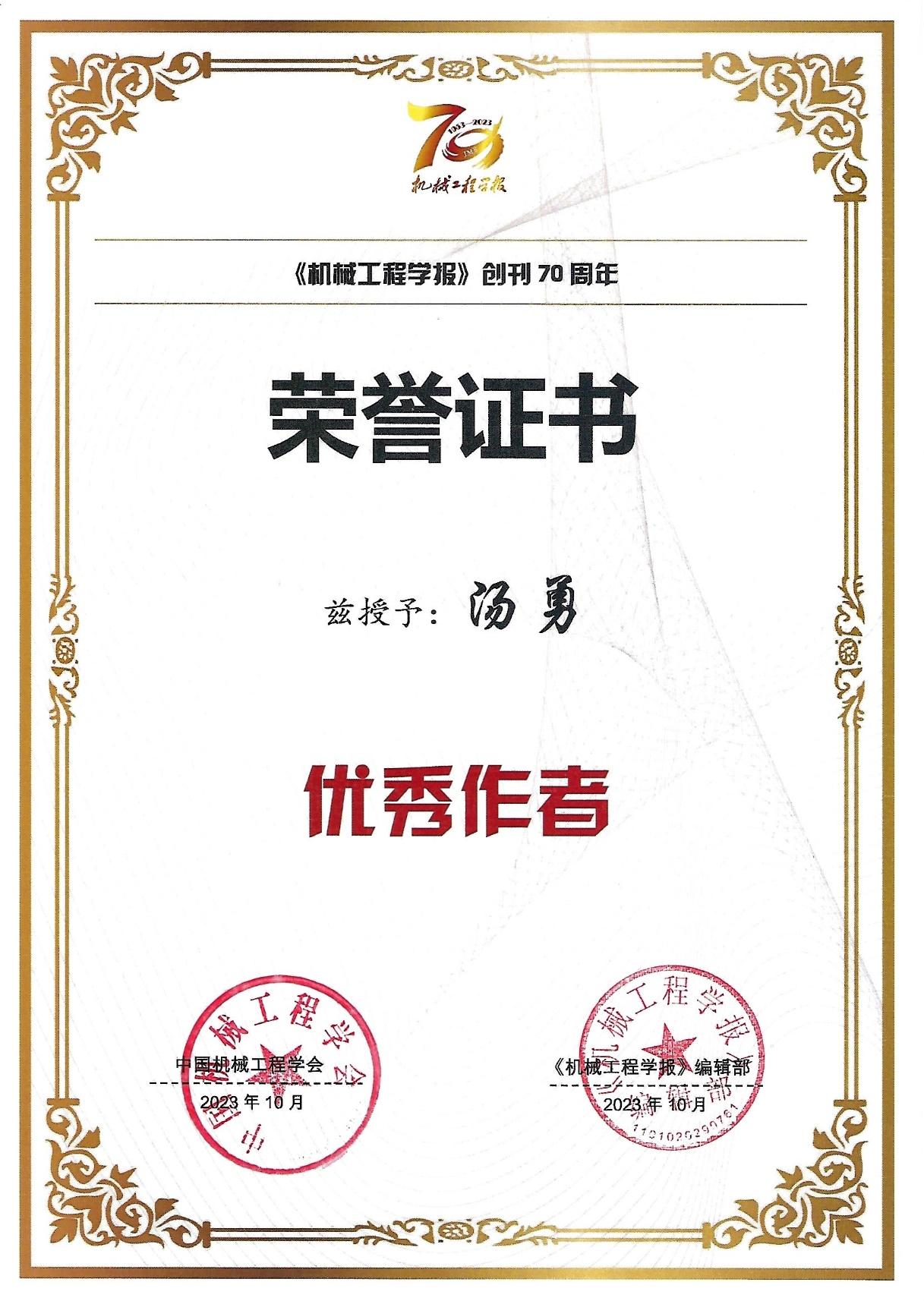 汤勇教授入选《机械工程学报》优秀作者名单。截至目前,汤勇教授在《机械工程学报》共发表 19 篇论文,其中以第一作者/通讯作者发表论文 9 篇。