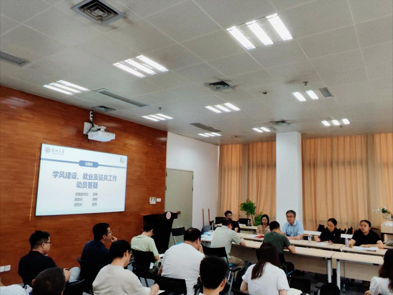 召开学风建设及就业征兵工作促进会。学院党委书记郑纯、副书记邓琳,副院长娄燕,各院长助理、系主任、专业负责人、班主任、研究生秘书、本科教学秘书、辅导员参加会议。