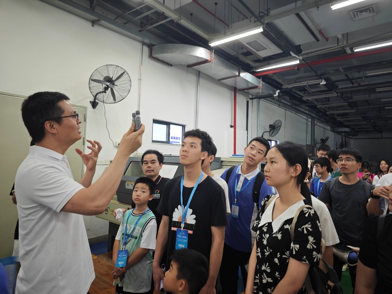 招生推介,欢迎在座学子报考深大并加入机电大家庭,勉励同学们“步履不停,终将遇见”,共同继承并发扬“精工践行,致臻如一”的工匠精神;彭芳锡向参访队伍介绍工程训练中心概况。实验室陈列柜上整齐摆放着各年级学生的创新实践作品和大型器械设备雕琢出的精细器件,吸引着学生们的目光,感受科技之美。