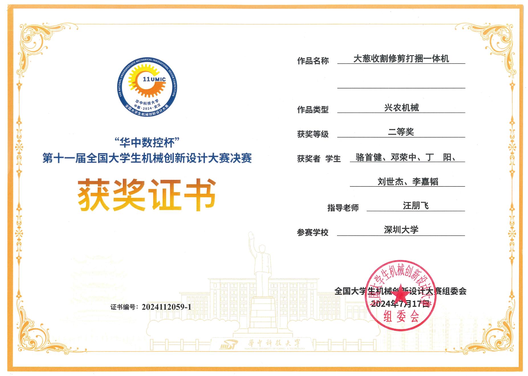 汪朋飞老师指导,骆首健、邓荣中、丁阳、刘世杰和李嘉韬 5 位本科生组成的学生团队创作的大葱收割修剪打捆一体机斩获全国二等奖。