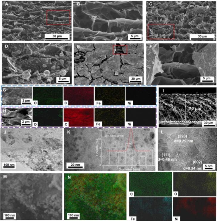 郭镇斌和清华大学深研院杨诚采用一种“仿爆米花”激光加工方法来制备覆盖有还原氧化石墨烯(rGO)的LIG复合薄膜,作为高质量电磁波吸收和屏蔽薄膜的多级结构,该薄膜均匀负载有铁酸镍纳米颗粒(rGO/LIG@NiFe2O4)。该方法通过在激光诱导石墨烯(LIG)结构上覆盖GO,将局部瞬时激光脉冲能量转化为空间均匀分布的热量。通过避免局部瞬时热积累和高温引起的爆裂,成功抑制了质量损失和结构损坏,从而有效避免了激光诱导石墨烯复合薄膜导电网络的损坏。这种均匀的热能分布使得具有高结晶度和超细尺寸(3.63±0.98 nm)的磁性纳米金属氧化物均匀分布在复合薄膜中。该复合薄膜在单面70 µm和双面166 µm厚度下分别实现了36 dB和51 dB的总EMI屏蔽效能,其中吸收率分别提高到75%和73%。EMI屏蔽效能和吸收率的显著提升表明,“仿爆米花”方法可以为开发具有优异性能特征的先进多孔复合材料提供一种多用途和普遍的解决方案。