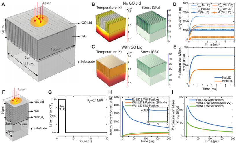 图3 激光加工过程中 LIG@NiFe₂O₄ 和 rGO/LIG@NiFe₂O₄ 复合结构的有限元分析