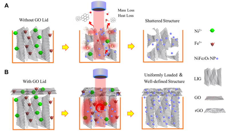 图1 A:传统激光制备过程中激光诱导石墨烯(LIG)复合结构的反应过程。B:引入GO盖后的激光制备LIG复合薄膜的反应过程。