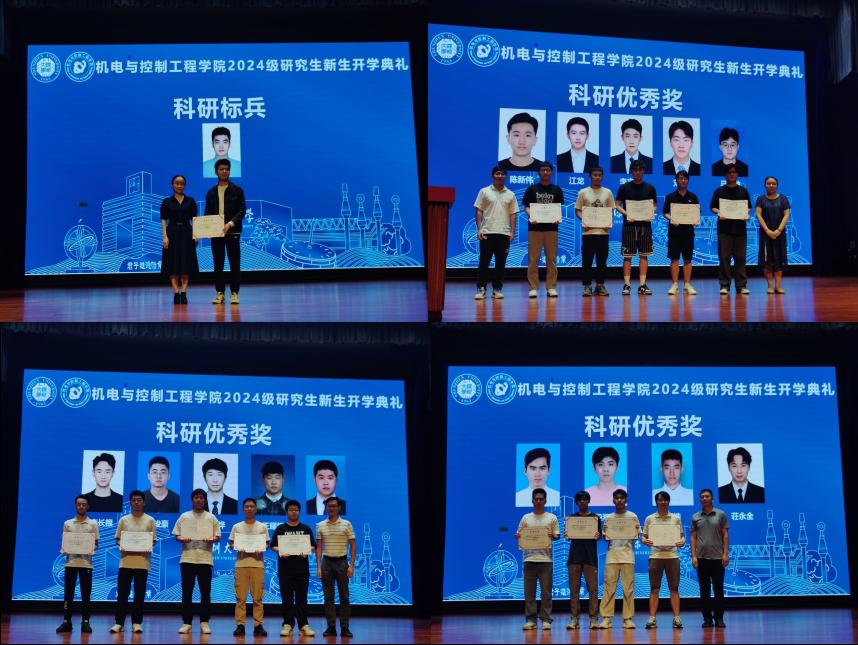 随后,龚峰宣读了学院 2023-2024 年度研究生科研优秀奖和科研标兵名单,张章获得研究生科研标兵荣誉称号,陈新伟、江龙、李宇健、刘勇、马骏驰、李长根、秦浚豪、石润烨、王耀辉、王泽鑫、杨锦锋、殷湘龙、张浩、荘永全14名同学获得研究生科研优秀奖。参会领导先后为获奖同学颁发了荣誉证书。