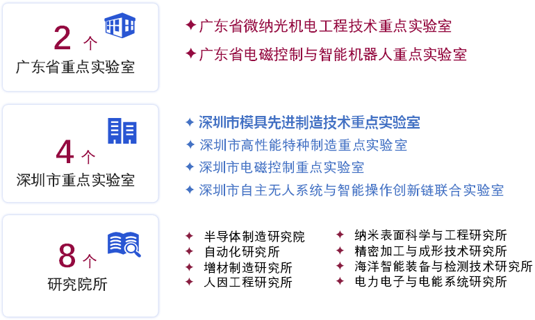 建有2个广东省重点实验室、4个深圳市重点实验室、8个研究院所和17个校外研究生培养基地(1个国家级、11个省级),为培养高质量研究生提供了重要保障。