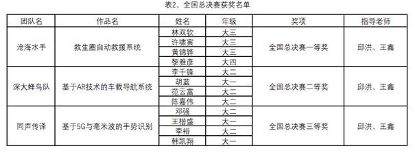 AutoLeaders创新实践俱乐部共组织并指导了六支队伍成功通过初赛进入分赛区决赛,其中共有“沧海水手”五支参赛队伍获奖。且“沧海水手”、“深大蜂鸟队“、”同声传译”三支参赛队伍出线进入全国总决赛。获奖参赛队伍指导老师为邱洪老师和王鑫老师。