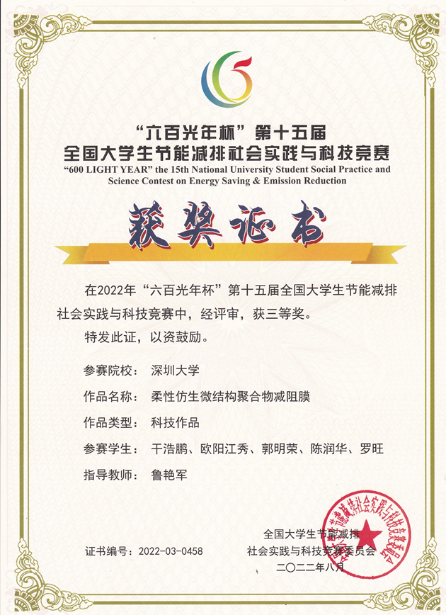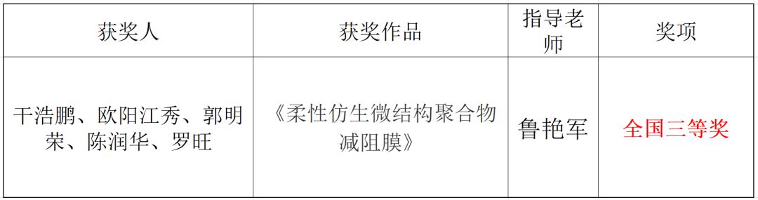 鲁艳军老师指导,干浩鹏、欧阳江秀、郭明荣、陈润华、罗旺等5位同学组成的代表团队充分备赛,作品《柔性仿生微结构聚合物减阻膜》获得全国三等奖的优异成绩!