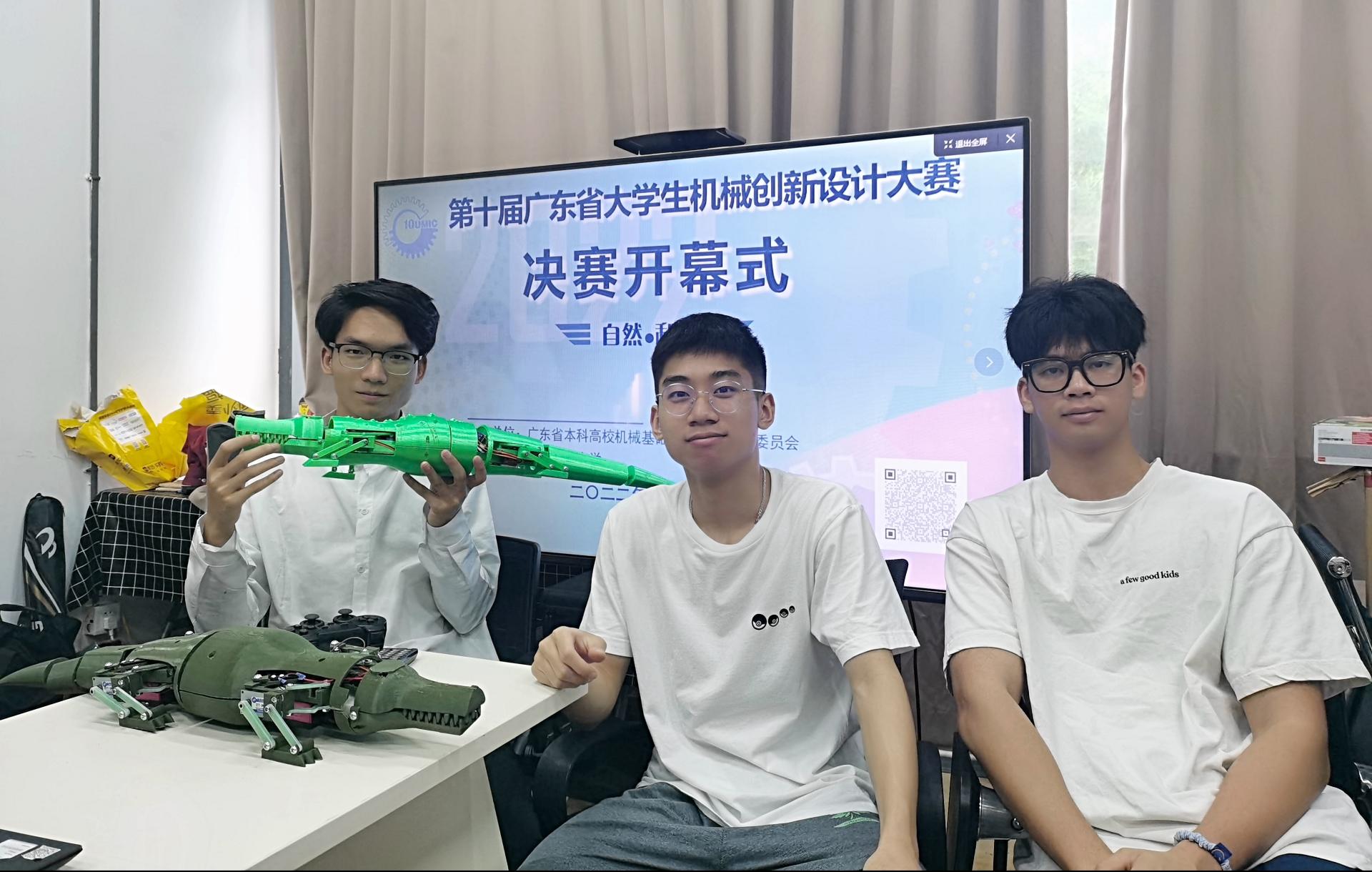 仿生鳄鱼团队刘楚军同学感想:这是我第一次带队参加比赛,一开始也没有想到可以走那么远,只是单纯想把自己的想法变成现实。因为最初提出项目构想的时候并不是很被人看好,也遭到过质疑,但这恰恰成为了我的动力。此外,因为我从小就喜欢看《我爱发明》和《动物世界》,而仿生机械正好是大赛的主题之一,这无疑给了我很大的信心。并且项目的运动原理也是得益于一个街舞动作给的灵感。有了兴趣和灵感的加持,项目做起来简直是一种享受。然而,因为疫情原因,比赛出现了很多变数。在队员们的相互协作下,我们见招拆招,最后走到了这一步。对我来说,这次比赛的收获不仅在于取得好的成绩,更在于迈出实践的第一步以及过程中获得的经验和能力。最后还要感谢老师们的支持和鼓励。