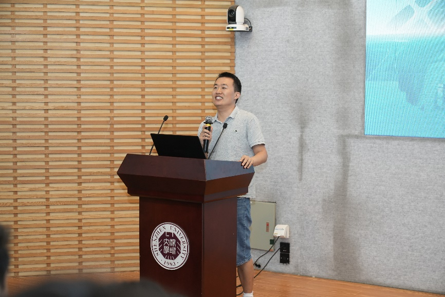 副院长龚峰教授发表了讲话。首先,他对大疆公司一直以来的支持表示感谢,并对所有热爱机器人事业的同学表示了鼓励与欢迎。随后,他肯定了深大 RobotPilots 战队在 RoboMaster 机甲大师赛 2023 赛季中的精彩表现,同时也高度赞赏了他们在机器人技术实践与创新方面的突出贡献。他表示,学院会尽最大努力鼓励学生们参加各类科技社团,并且依托社团参加科技竞赛,同时提升同学们的自主创新能力。最后,他希望 RobotPilots 战队能够继续努力,在新的一年里再创佳绩,并希望越来越多的同学能够参加到创新的队伍当中来,锻炼自己的专业能力,增强团队协作的精神,不断取得新的进步。