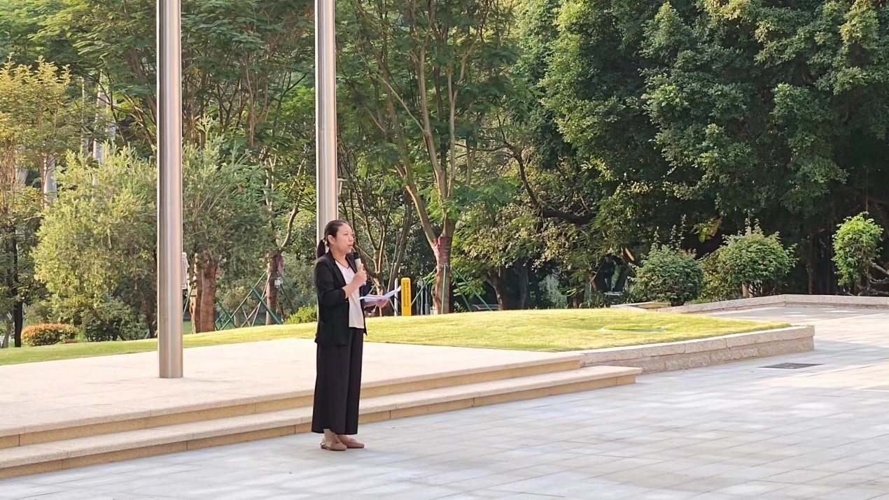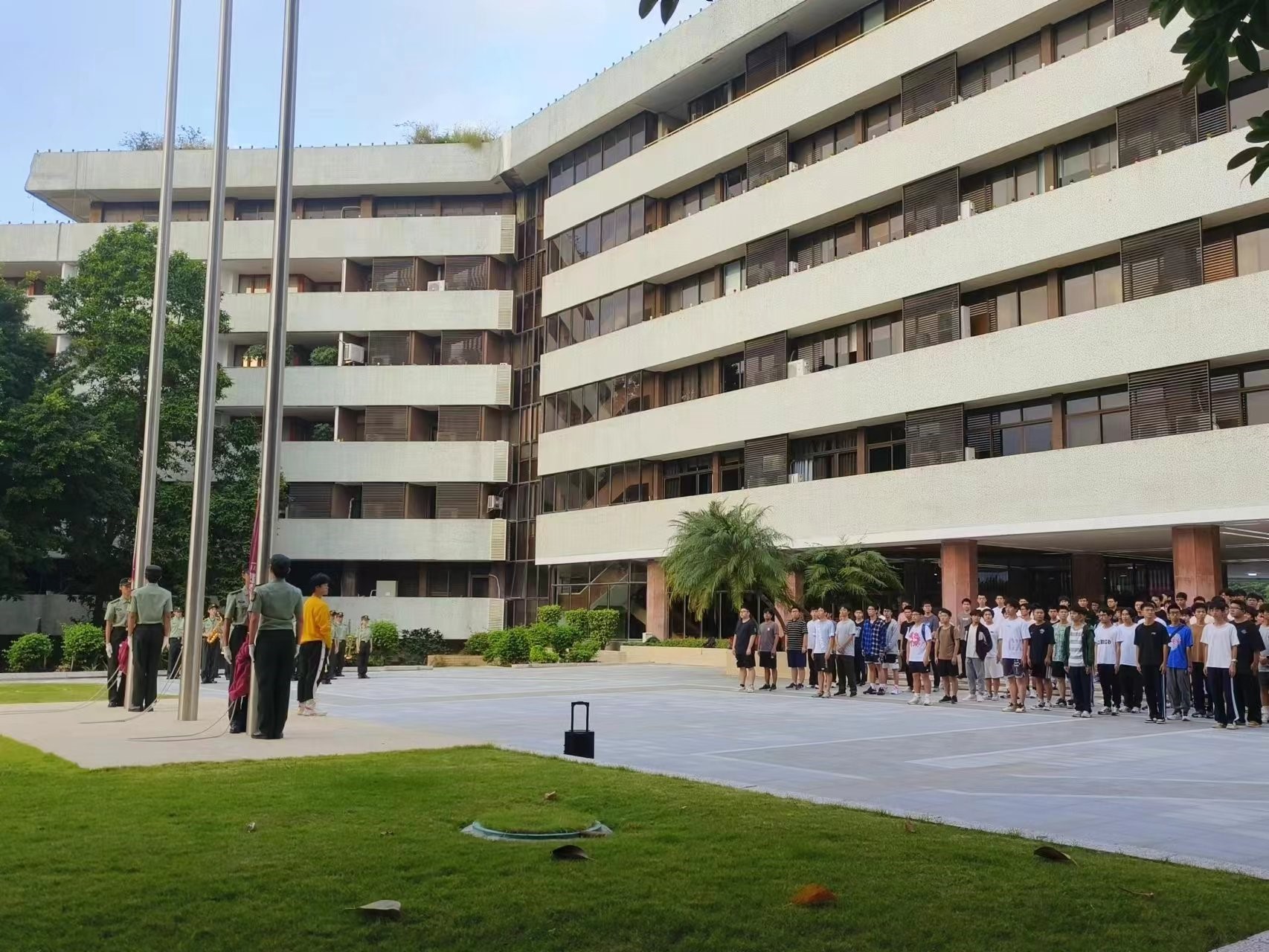 校旗在《歌唱祖国》乐声中缓缓升上旗杆,唤醒荔园新的一天。