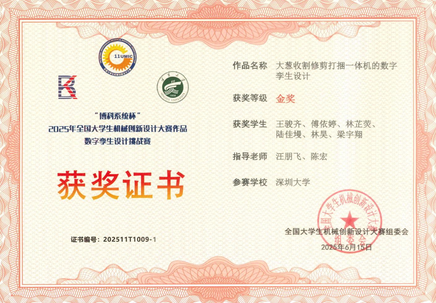 6月6日至7日,“博科系统杯”2025年全国大学生机械创新设计大赛作品数字孪生设计挑战赛全国总决赛在宁夏大学举行。决赛现场,来自全国36所高校的55支代表队展开激烈角逐,其中包括西安交通大学、华中科技大学、天津大学等知名高校的参与。经过精彩的作品演示与答辩,由麻豆成人 汪朋飞和陈宏两位老师指导,王骏齐、傅依婷、林芷荧、陆佳墁、林昊、梁宇翔等6位本科生组成的学生团队完成的作品《大葱收割修剪打捆一体机的数字孪生设计》荣获国家级金奖,并在颁奖典礼上受到大赛评审组的点名表扬。同时,指导老师摘得本届比赛的“优秀指导教师”奖。