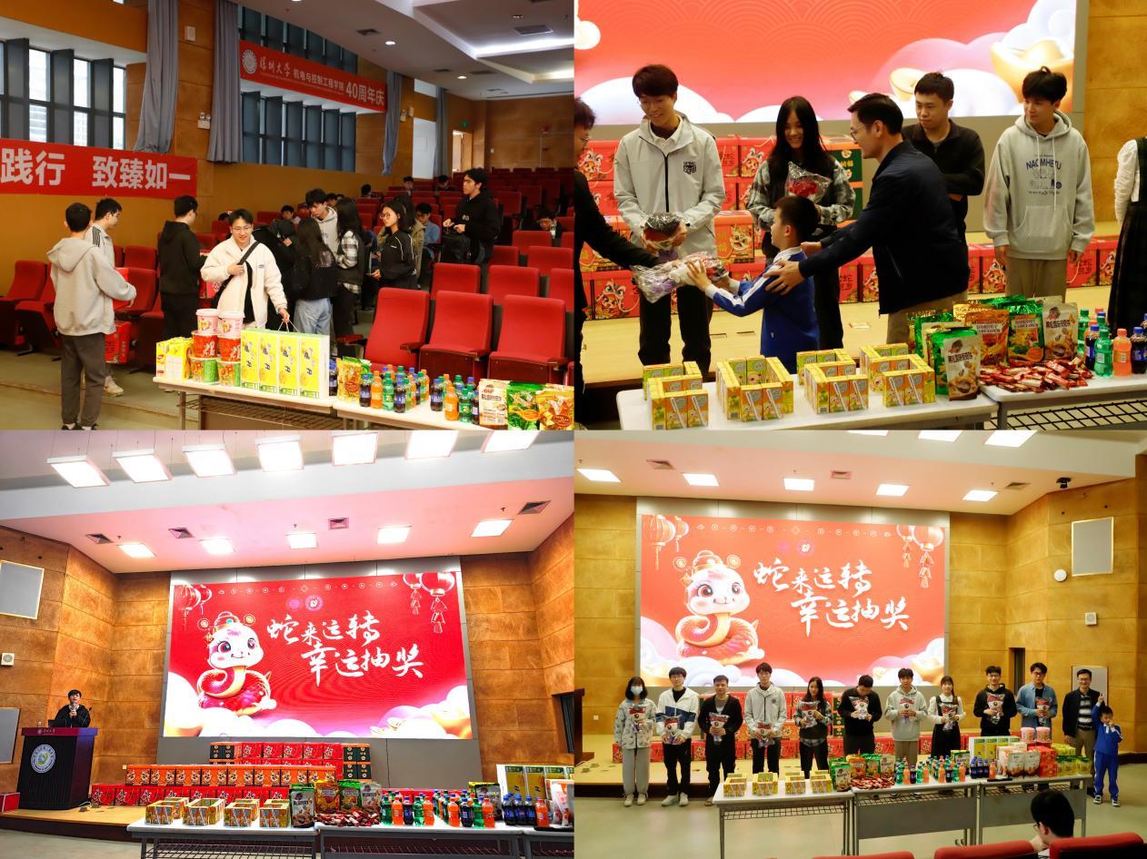 2025年1月23日,活动举行当天,学院领导、辅导员及留校学生欢聚一堂。由院领导领衔,一众辅导员与志愿者们,怀揣着满满的温情,手捧精心筹备的新春礼包,将一份份沉甸甸的关怀与祝福,轻轻放置在留校学子的心田。期间穿插的“蛇来运转”抽奖环节更是将气氛推向了高潮,一份份别致的玩具盲盒和荔园文创奖品,让每一位参与者都感受到了节日的惊喜与欢乐。